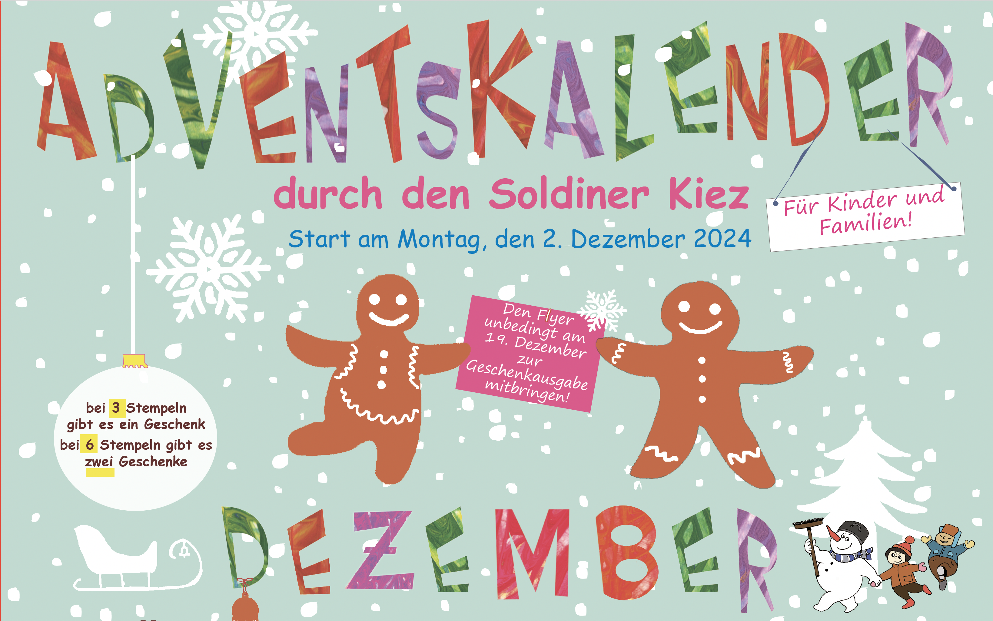 Am 2.12. startet wieder der „Adventskalender durch den Soldiner Kiez“ mit einem gemeinsamen Adventssingen und Waffelbäckerei. Kinder und ihre Familien können bis zum 19.12. jeden Tag in einer anderen Einrichtung hier im Kiez an